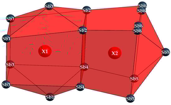 Another substructure within these compounds is that of the antimony–oxygen environment. Most of the Sb3+ cations, together with four oxygen atoms, form trigonal -bipyramids [SbO4]5− (Sb1–Sb5, Figure 12), which are linked to each other either by an edge (Sb2 with Sb3 and Sb1 with Sb4) or by a corner (Sb1 with Sb3 and Sb5 with Sb4, as well as Sb5 with Sb6). In contrast, the (Sb6)3+ cations form ψ1-tetrahedra [SbO3]3− (Figure 12) with only three oxygen atoms each, which in turn are linked to one another via edges (O6···O6). The oxygen atom O7 remains terminal, and both O6 atoms link two open “halfpipes” with two (Sb6)3+ cations each as linkers to form a “double-halfpipe” {[Sb12O19]2−} (Figure 12). Within these so-called “double-halfpipes”, the antimony–oxygen distances range from 197 to 225 pm (plus 254 pm) for La2Sb12O19Br4 and from 192 to 227 pm (plus 256 pm) for La2Sb12O19I4, which agree quite well with literature values of d(Sb–O) = 198–202 pm (plus 251 and 262 pm) in valentinite (β-Sb2O3) [27] and come slightly higher than d(Sb–O) = 198 pm (3×) in senarmontite (α-Sb2O3) [26], but show a high degree of diversity.