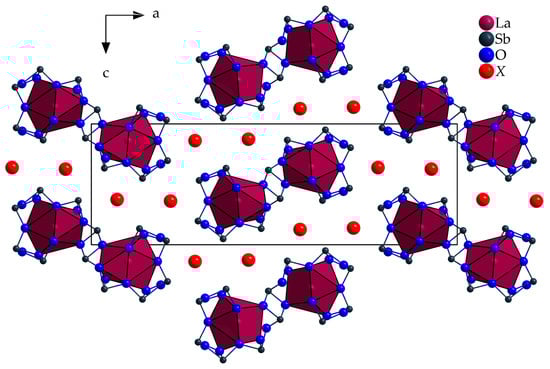 Extended unit cell of the crystal structure of both La2Sb12O19X4 representatives (X = Br and I) as viewed along [010].