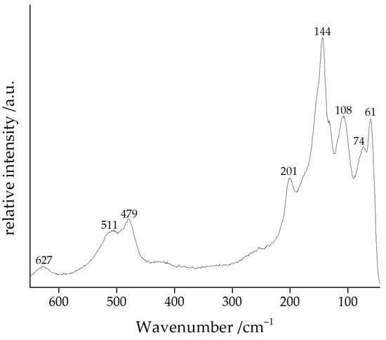 The Raman spectrum of La2Sb12O19I4, shown in Figure 16, was recorded at an excitation wavelength of λ = 532 nm. At a wavenumber of 627 cm−1, the push-pull valence vibration can be seen, which is much more pronounced in contrast to the chloride derivatives RESb2O4Cl (RE = Y, Sm–Lu) [3,6,12,13,14], while the valence vibration in the common mode can not be detected in the spectrum at all. This is due to the presence of isolated [Sb4O8]4−-ring units consisting of four vertex-connected ψ1-tetrahedra [SbO3]3− in the RESb2O4Cl examples, while in La2Sb12O19I4 and La2Sb12O19Br4, endless “double-halfpipes” of antimony and oxygen with mostly tetracoordinated Sb3+ cations are encountered. Furthermore, the peaks at 511 and 479 cm−1 can be assigned to the symmetric deformation vibrations of the vast minority of ψ1-tetrahedra [SbO3]3−. At 201, 144, 108, 74, and 61 cm−1, several bands are found, which probably belong to lattice vibrations [29,30].