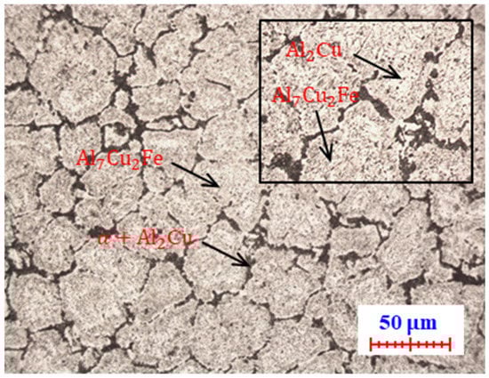 The originally homogenized microstructure of 2219 aluminum alloy is shown in Figure 1. The initial microstructure of the material consists of an matrix phase, an phase dissolved in the matrix, and an elongated phase. One of the purposes of the process design is to eliminate the elongated phase, which can cause stress concentration by splitting the α matrix phase and ultimately degrade the material’s mechanical properties.