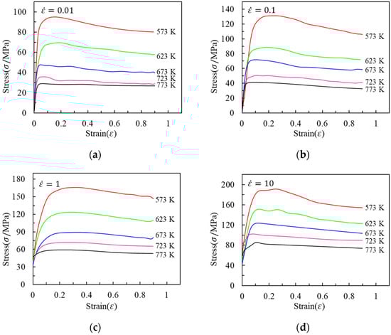 Flow stress–strain curves of 2219 Al alloy during hot compression at strain rates of (a) 0.01 s−1, (b) 0.1 s−1, (c) 1 s−1, and (d) 10 s−1.