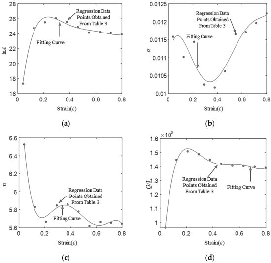 The material parameters of ln, , , and at each strain level can be obtained with multivariate nonlinear regression of Equation (2) using flow stress data (Table 3). Next, the curves of -, -, - and - can be obtained using these regression data. The polynomial fitting of -, -, - and - is conducted to obtain the constitutive equation with strain compensation by using flow data listed in Table 3.