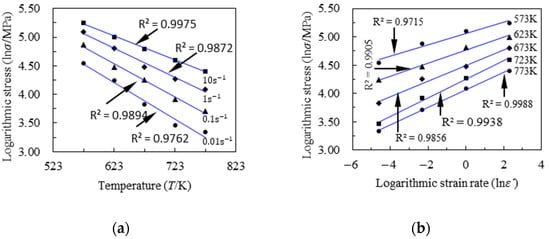 The logarithmic stress–temperature and logarithmic stress–logarithmic strain rate curves are shown in Figure 4.