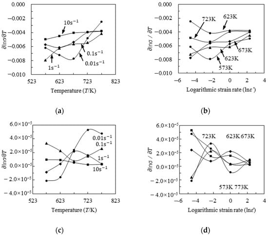 At a strain of 0.209, the higher-order partial derivatives of logarithmic stress with respect to temperature at different temperatures (573 K, 623 K, 673 K, 723 K, and 773 K) and strain rates (0.01 s−1, 0.1 s−1, 1 s−1, and 10 s−1): (a) first-order derivative distributed on temperature, (b) first-order derivative distributed on the logarithmic strain rate, (c) second-order derivative distributed on temperature, and (d) second-order derivative distributed on the logarithmic strain rate.