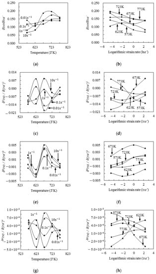 At a strain of 0.209, the higher-order partial derivatives of logarithmic stress with respect to the logarithmic strain rate at different temperatures (573 K, 623 K, 673 K, 723 K, and 773 K) and strain rates (0.01 s−1, 0.1 s−1, 1 s−1, and 10 s−1): (a) first-order derivative distributed on temperature, (b) first-order derivative distributed on the logarithmic strain rate, (c) second-order derivative distributed on temperature, (d) second-order derivative distributed on the logarithmic strain rate, (e) third-order derivative distributed on temperature, (f) third-order derivative distributed on the logarithmic strain rate, (g) fourth-order derivative distributed on temperature, and (h) fourth-order derivative distributed on the logarithmic strain rate.