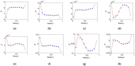 Regression values of material parameters at different strain levels and their polynomial fitting curves: (a) -ε, (b) -ε, (c) -ε, (d) -ε, (e) -ε, (f) -ε, (g) -ε, (h) -ε.