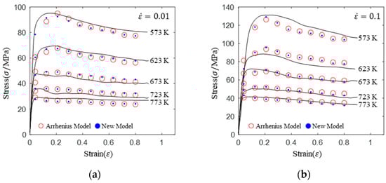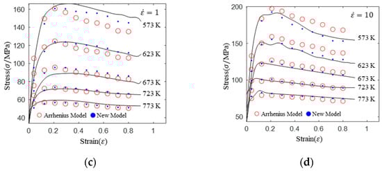 As can be seen from Figure 8a,b, at a low strain rate (0.01 s−1 and 0.1 s−1,) the prediction accuracy of the new model was slightly higher than that of the Arrhenius model. The comparison of correlation coefficients in Figure 9a,b can prove this phenomenon. However, as shown in Figure 8c,d, the prediction accuracy of the new model was significantly higher than that of the Arrhenius model at high strain rate (1 s−1 and 10 s−1) and low temperature (573 K and 623 K) levels. In addition, with increasing deformation temperature, the prediction accuracy of the Arrhenius model also increased at a constant strain rate. The new model had a similar prediction accuracy at each deformation temperature and deformation strain rate, and the prediction accuracy was higher than that of the Arrhenius model.
