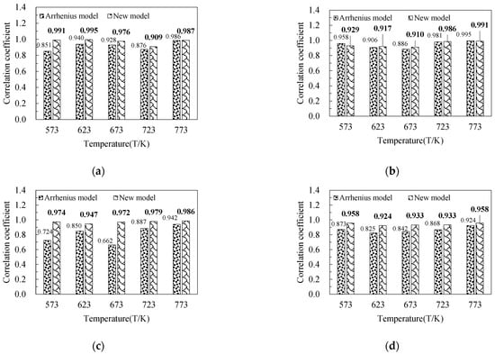 To further analyze the prediction accuracy, correlation coefficients were calculated at different strain rates and temperatures and are shown in Figure 9. It is well known that a larger value of the correlation coefficient indicates a higher prediction accuracy. As can be seen from Figure 9a,b, all the other correlation coefficients of the new model were slightly higher than those of the Arrhenius model, with one particular exception (0.1 s−1 and 573 K). In addition, the correlation coefficient of the Arrhenius model was slightly higher than that of the new model in this particular exception. As can be seen from Figure 9c,d, all the correlation coefficients of the new model were significantly higher than those of the Arrhenius model.