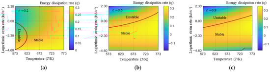 Next, the analytical formulas of the energy dissipation rate and the instability factor can be obtained by putting Formula (13) into Formulas (11) and (12). Hot processing maps at low (0.2), medium (0.6), and high (0.9) strain levels were drawn, as shown in Figure 10.