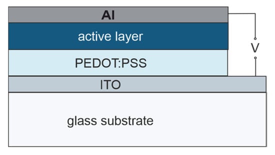 Photovoltaic structures with mass heterojunction were fabricated on glass substrates with dimensions of 15 × 15 mm2, covered with an ITO layer. Before applying subsequent layers, these substrates were cleaned in an ultrasonic cleaner, rinsed in solvents (water, 2-propanol and acetone) and dried in the air. A layer of PEDOT:PSS was applied to the cleaned substrates with the ITO layer, which was then heated under a vacuum at 100 °C for 40 min. The PEDOT:PSS layer was covered with an active layer, which was a mixture of P3OT and the appropriate PQX1-–4 dissolved in THF. The layers were applied by the spin-coating method. An aluminum electrode was deposited on the active layer in a high vacuum (10−6 bar). Five OPV structures were made with each PQX isomer.