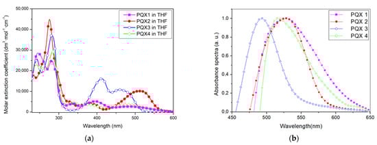 In Figure 5, the spectrum of absorption measurement in the UV-Vis range of solutions in THF (Figure 5a) and thin films (Figure 5b) of the PQX1–4 isomers are shown. Thin films of dyes were prepared by dissolving the appropriate isomer in THF and applying the solution to a glass substrate by dripping and drying the layer in the air. In the spectra recorded in the THF solution, each isomer is characterized by three intense absorption bands. The first of them—sharp peaks in the ultraviolet range (230–340 nm)—could be found with π-π* transitions. The second band is in the violet part of the visible spectrum (395 nm for PQX1, 380 nm for PQX2, 412 nm for PQX3, and 375 nm for PQX4), and the third visible band is in the blue, green, and common yellow parts of the visible spectrum. In the spectrum, a transition band between the ground state S0 and the excited state S1 is observed, with a maximum ranging from 460 nm to 512 nm in THF solutions.