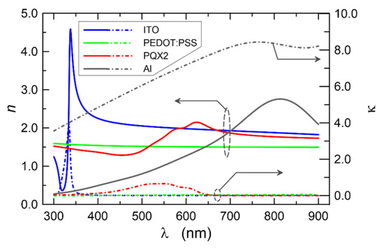 A theoretical analysis of photovoltaic cells was carried out using a coherent model. The calculations were carried out using the transfer 2 × 2 matrix method [29]. Due to the fact that for all PQX, the determined extinction coefficients have similar values, we present below the results only for the PQX2 molecule. In the calculations made using the 2 × 2 matrix method, we took into account the complex refractive indices of the component layers of the OPV_2 photovoltaic cell, whose dispersion characteristics are shown in Figure 8.