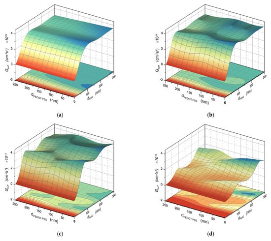 Figure 9 shows the effect of the thickness of the PEDOT:PSS and PQX2 layers on the surface density of excited excitons Gsurf for the selected wavelengths of 500 nm (a), 550 nm (b), 600 nm (c), and 650 nm (d), respectively. The surface density of excited excitons is defined as follows: