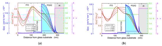 The calculated characteristics for oblique illumination of the structure were plotted with the same colors, but with discontinuous lines, for light with s polarization (Figure 10a) and p polarization (Figure 10b), respectively. It can be seen that with oblique illumination of the solar cell, for both polarizations of the incident light, the densities of excited excitons in the area of the PQX2 active layer decrease. However, these changes are stronger for the s polarization. At the PEDOT:PSS/PQX2 interface, there is a clear decrease in the density G of excited excitons, while for the p polarization, a slight increase in G can be seen with the increase in the illumination angle. As a result, based on the results presented here, it can be concluded that in real conditions, when a solar cell is illuminated with non-polarized light, its efficiency will decrease with the increase in the illumination angle.