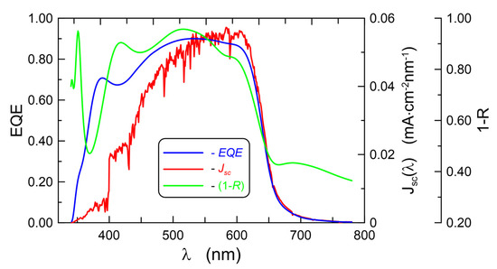 The aim of the optical optimization of the photovoltaic cell is to achieve the highest possible efficiency in the conversion of optical radiation into electric current. The aim is to ensure that the largest possible part of the incident radiation on the photovoltaic cell is absorbed in it. The absorption of radiation in a photovoltaic cell is given by (1-−R). This dependence for the photovoltaic cell with the PQX2 active layer is plotted with the green line in Figure 11.