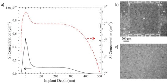 Unintentionally doped GaN was grown 2.2 μm thick on c-plane sapphire using a 25 nm AlN buffer layer. The growth temperature of the GaN was 1020 °C at a pressure of 200 Torr and a growth rate of 2.2 μm/h [31]. The GaN film was etched with 10 μm wide trenches approximately 1.5 μm deep via Ar/Cl RIE to isolate measurement structures and imprint sample identification markings. Samples were then coated with 30 nm of PECVD SiNx at 600 °C for protection during ion implantation and subsequently patterned using standard photolithography processes, utilizing 3 μm of photoresist to locally block the implant to produce Van derPauw structures and linear and circular transmission line measurements (TLMs). Silicon was implanted at 7 degrees and room temperature using energies ranging from 15 to 360 keV, as previously reported [32], to approximate a 1 × 1019 cm−3 box profile that was ~335 nm deep (at 5 × 1018 cm−3 concentration) with a surface concentration of 5 × 1019 cm−3 and thus facilitate electrical contact (as shown in Figure 1a). The implant total dose was 5 × 1014 cm−2, of which 4.24 × 1014 cm−2 was expected to reside in the GaN according to SRIM calculations, with the rest having remained in the implant cap. Previous SIMS measurements have shown very good agreement between SRIM and as-implanted dopant profiles. After implantation, samples were cleaned in heated Piranha solution and then concentrated HF solution to remove photoresist and implant cap. After cleaning, wafers were coated with a 200 nm PECVD SiNx anneal cap (n~1.99 via ellipsometry), diced into coupons, and annealed under various SMRTA conditions. Figure 1b shows the central region of sample 2A after dicing, and Figure 1c shows the same area after annealing at a peak temperature of 1500 °C. After annealing, the cap was removed in HF immediately before the electron beam evaporation of standard Ti/Al/Ni/Au contacts and measured as deposited.