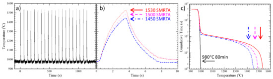 (a) Observed temperature profile of SMRTA pulses during 1530 °C anneal. To ensure a greater focus on pulses, preceding and subsequent static annealing steps at ~980 °C are not shown. (b) Average of all 20 pulses for each SMRTA annea and (c) cumulative time duration at or above the indicated temperature for each SMRTA anneal and an 80 min anneal at 980 °C.