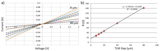 Contact and GaN sheet resistance was first characterized via linear TLMs with pad separations ranging from 4 to 80 μm using a Keithly 4200SCS SMU. Figure 3a shows ohmic contacts of TLM pads, while Figure 3b shows the well-behaved nature of contacts in the implanted region after the 1500 °C SMRTA. Hall effect was measured on a Lakeshore Cryotronics system with M90 Fast Hall across ±0.95 T field at 300 K. Contacts were determined to be ohmic as deposited, with specific contact resistances of 1.6 to 6.6 × 10−5 Ω-cm2, and TLM-extracted sheet resistances exhibited good agreement with measurements of Van der Pauw structures during AC Hall effect testing. No contact-alloying anneal was utilized and no trend was observed in contact resistance as a function of the SMRTA peak temperature.