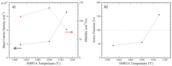 (a) Implanted GaN sheet carrier density (black circles, left axis) and mobility (red squares, right axis) and (b) resultant activation efficiency as a function of peak annealing temperature.