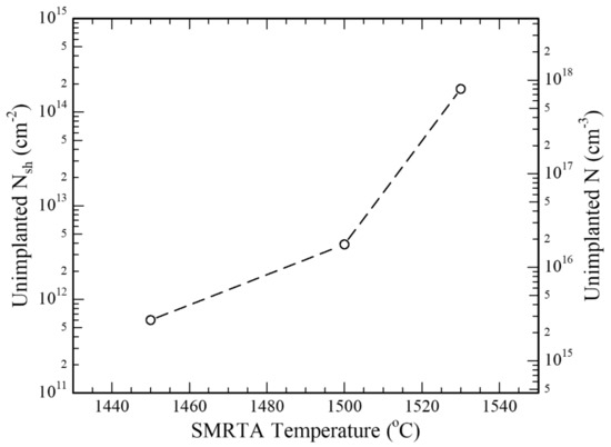 Un-implanted, unintentionally doped GaN carrier concentration (sheet—left axis; volumetric—right axis) after SMRTA annealing as a function of peak annealing temperature.