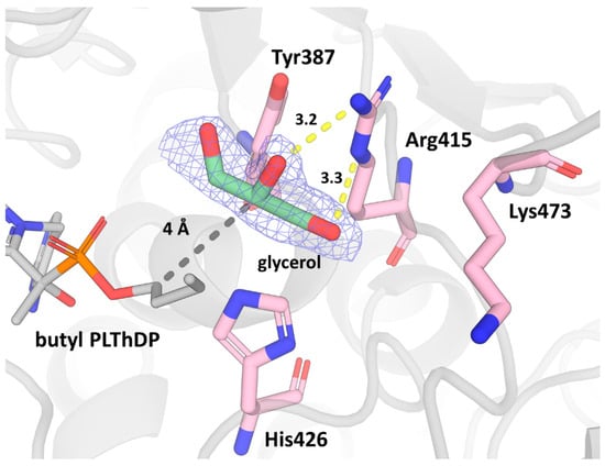 The presence of butyl PLThDP and additional molecules emphasizes that the large active site can be used to develop molecules that are more selective for DXPS simply by extending the alkylAPs to reach the GAP binding site. The distance between the butyl PLThDP and the glycerol molecule is 4 Å; therefore, linkers of 2–3 carbons might already be enough to link the two regions (Figure 3).