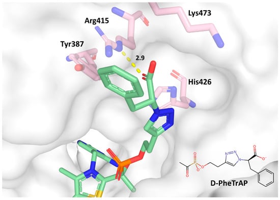 Most docking poses were similar, with the carboxylic acid moiety interacting with the GAP binding site and only the phenyl ring adopting different conformations. The carboxylic acid group interacts with Arg415 similarly to glycerol, while the 1,2,3-triazole ring links the other groups to the GAP binding site (Figure 4). Lys473 was not shown to interact with the docked molecule, likely due to its orientation facing out of the active site in the BAP-bound structure. Flexible docking, by sampling the conformational space of Lys473, was performed using smina [] to confirm that the residue can change its conformation to interact with the compound. Poses similar to the previous one were obtained via Lys473 interacting with the carboxylic moiety and Arg415 making close contact (Figure S1). In agreement with the observed improvement of affinity between BAP and D-PheTrap for E. coli DXPS, the predicted binding energies of BAP and D-PheTrap were −7.4 kcal/mol and −8.2 kcal/mol, respectively. However, calculated binding energies from docking approaches should be treated with caution as they can be unreliable due to the scoring functions implemented, making comparisons between different molecules based purely on energies somewhat unreliable.