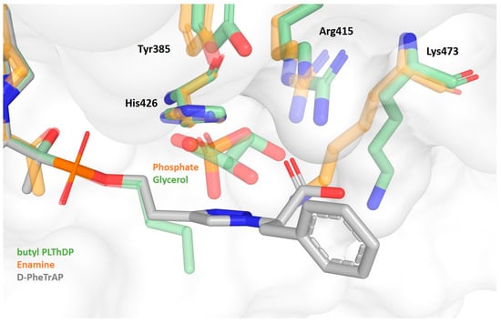 Clear electron density for the butyl PLThDP can be seen in the active site of both chains confirming that, as expected, BAP reacts with ThDP to form a stable adduct (Figure 1B,C). The butyl PLThDP is stabilized similarly to the PLThDP in Deinococcus radiodurans DXPS (DrDXPS) []. The pyrimidine ring stacks with Phe390 to guarantee the correct orientation of the cofactor, allowing the N4′ amino group to interact with the main chain carbonyl of Ser112 and the C2α-hydroxyl group of the phosphonolactyl moiety. The phosphonates are further stabilized by a hydrogen bond with His40, which is known to be important for catalysis, [] and a water-mediated hydrogen bond with His426 (Figure 2A,B). Finally, the butyl moiety adopts a linear structure with a less-defined electron density for the terminal carbons. The higher degree of freedom, together with the extended DXPS active site, can explain the flexibility and lack of clear density for those atoms.