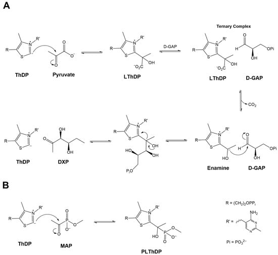 (A) Reaction mechanism of DXPS. (B) Reaction mechanism of methylacetylphosphonate (MAP) inhibition.