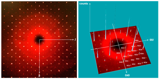 First, we went back to space group determination in order to inspect the exception from systematic absences in more detail. In reducing the gap between observed and unobserved reflections, the criteria of the glide plane vanished, and space group P21c came into sight. Second, we simulated precession photography of the 0kl-layers from the raw data sets. For M = Sn, this layer image (Figure 3) revealed that all reflections (0kl) with k + l = uneven are present but considerably weaker than those with k + l = even. In the case of our quite large single crystals, these reflections were measurable with sufficient precision, but when scaling down the size of the crystals (M = Pb), they vanish in the background and become undetectable.