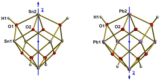Comparing the bond lengths of tin and lead in the M6O4(OH)4 molecules, the latter are 0.089/0.097 Å [ΔmeanBLax/ΔBLeq] longer than those in the tin molecule. These values are of the same magnitude as the differences between the atom radii of tin and lead calculated from SCF functions [33].