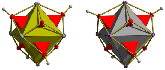 All faces of the {M6}-octahedra are capped by oxygen atoms alternating between μ3-O and μ3-OH types. The resulting {O4}-tetrahedra are significantly larger for the μ3-OH atoms [O2] than those of the μ3-O atoms [O1]. In both cases, the fourfold rotoinversion axes cross two opposite O···O edges. Labeling the edge to opposite edge distances in direction of the c-axis with d1 and those in the ab-plane with d2, the tetrahedra of the μ3-OH atoms are elongated for M = Sn [d1/d2 = 3.011(2)/3.045(2)] and compressed for M = Pb [d1/d2 = 3.172(6)/3.142(6) Å] while for the tetrahedra of the μ3-O atoms the proportions go into revers: for M = Sn [d1/d2 = 2.226(2)/2.190(2) Å] the tetrahedron is compressed and for M = Pb [d1/d2 = 2.308(6)/2.371(6) Å] it is elongated. All in all, the three polyhedra are arranged in the form of a stella octangula (Figure 5).