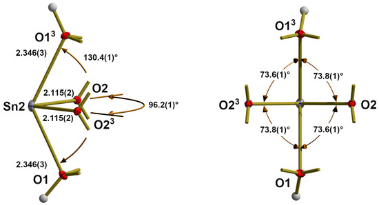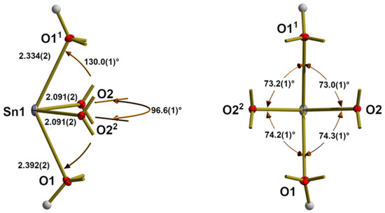 Both crystallographic independent metal atoms are fourfold, seesaw (ss) coordinated with two μ3-oxygen atoms [O2] in equatorial and two μ3-hydroxyl groups [O1] in axial positions (Figure 7 and Figure 8 for M = Sn; Figures S3 and S4 for M = Pb). Although these {MO4}- coordination polyhedra only exhibit C1 [M1] and C2 point group symmetry [M2]—the twofold rotation axis is part of the crystallographic, fourfold rotoinversion axis—their bond lengths and angles only differ marginally from those for an ideal bent seesaw coordination of point group symmetry C2v. Therefore, they can be thought of as prototypes for the {MO4}ss-coordination of bivalent tin and lead.