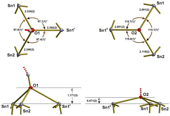 Different views [above = from top, below = side view] on the ball-and-stick models of the trigonal-pyramidal coordination of O1 (left) and O2 (right) with bond lengths [Å] and angles [°]; additional bonds of the oxygen atoms are indicated as shortened sticks; symmetry operations used to generate equivalent atoms: (1) y, −x, −z; (2) −y, x, −z.