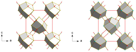 Packing of the Sn6O4(OH)4 (left) and Pb6O4(OH)4 (right) molecules looking down the b-axis. The different absolute structures of both can be recognized when looking at the central molecules, inspecting their faces, and analyzing their hydrogen bonds.