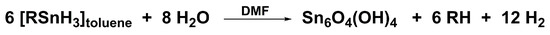 Sn6O4(OH)4: A lot of well-shaped, large, colorless single crystals (Figure 1) of the tin compound have been grown over more than a decade from solutions of various monoorganotin(IV) trihydrides, RSnH3, in mixtures of toluene and N,N-dimethylformamide, DMF. These samples were originally prepared to get monoorganotin(IV) clusters, (RSn)n, via hydrogen elimination in DMF, a reaction well established [24,25,26] in the case of triorganotin(IV) hydrides, R3SnH, and diorganotin(IV) dihydrides, R2SnH2, resulting in the formation of hexaorganodistannanes, (R3Sn)2 [27], and diorgano-cyclo-polystannanes, (R2Sn)n [28], respectively. From a chemical point of view, some aspects of the formation of Sn6O4(OH)4 under these experimental conditions are unusual: (i) the reduction of the four-valent tin atoms in the trihydrides to bivalent ones in the title compound; (ii) the cleavage of the carbon-tin bonds; and (iii) the origin of oxygen. As the well-closed flasks with the trihydrides preserved their red color over the complete time of storage without fading but bleached within some hours when coming into contact with air, the origin of oxygen in the title compound from O2 can be excluded. More likely, the oxygen content results from traces of water still present after drying the reaction solutions of the trihydrides conventionally with sodium sulfate. A possible reaction equation is sketched out in Scheme 1.