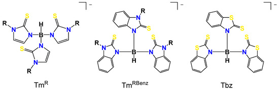 Schematic drawing of the ligands: tris(3-R-2-sulfanylidene-1H-imidazol-1-yl)hydroborate (TmR), tris(3-R-2-sulfanylidene-1H-benzimidazol-1-yl)hydroborate (TmRBenz), and tris(2-sulfanylidene-1H-benzothiazol-1-yl)hydroborate (Tbz).