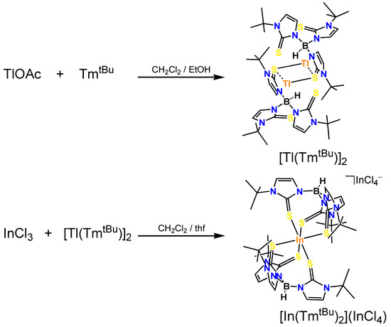 The reactions of the ligand K(TmtBu) [22,23,24,25] with one equivalent of thallium(I) acetate (TlOAc) were carried out at room temperature, and single crystals of the thallium(I) complex, formulated as [Tl(TmtBu)]2∙2H2O, were obtained by slow evaporation of a dichloromethane/ethanol solution at room temperature (Figure 2). The indium(III) complex, [In(TmtBu)2](InCl4), was obtained by the reaction of [Tl(TmtBu)2] with indium(III) chloride InCl3∙4H2O. The colorless crystals were obtained from the mixed solution of the saturated dichloromethane/toluene solution (Figure 2).