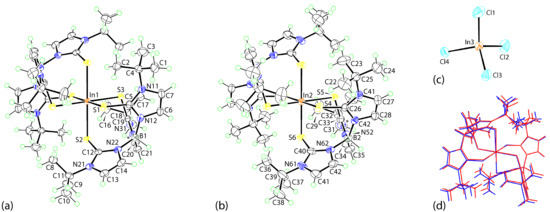The asymmetric-unit of [InIII(TmtBu)2](InCl4) comprises two independent complex cations, each disposed about a center of inversion, and a InCl4− anion; the molecular structures are shown in Figure 4a–c. Focusing on the In1-containing molecule, the In1 atom is coordinated by two tripodal TmtBu ligands to define a soft S6 donor set, which defines an octahedral geometry. The geometry is slightly flattened, as the In1–S1 bond length of 2.5682(4) Å is systematically shorter than the In1–S2, S3 bond lengths of 2.6597 (4) and 2.6429(4) Å (Table 4). Despite this difference, the C5–S1 bond lengths are equal within experimental error. Otherwise, the deviations from the ideal octahedral geometry are small, as noted from the relevant angles included in Table 4. As highlighted by the dihedral angles between the pyrazolyl rings listed in Table 4 and the overlay diagram of Figure 4d, there is close agreement between the independent molecules. This observation notwithstanding, there are notable differences in the In–S bond lengths. Thus, in the first independent cation of [InIII(TmtBu)2](InCl4), one In–S bond length is 0.07–0.10 Å shorter than the others, whereas in the second independent cation, the differential between the In–S bond lengths is significantly smaller, i.e., the difference between the shortest and longer bond lengths is now 0.02–0.08 Å.