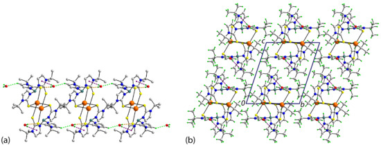 The crystallographic asymmetric unit of [TlI(TmtBu)]2∙2H2O comprises one-half of a dimeric complex molecule, being located about a center of inversion and a water molecule of crystallization. The complex molecule is shown in Figure 3a and comprises a central, diamond-shaped core with almost equivalent Tl1–S1, S1i bond lengths (Table 2). The four-coordinate geometry for thallium is completed by the thione-S2 and symmetry-related thione-S3i atoms. An indication of the coordination geometry defined by the S4 donor set is τ4, which is computed from [360 − (α + β)]/141, where α and β are the two widest angles subtended at the thallium(I) atom [32]. In this case, τ4 = 0.63, which corresponds to a seesaw geometry (τ4 = 0.64); the widest angle corresponds to S2–Tl1–S3i, i.e., 156.32(3)°. The TmtBu ligand is therefore tetra-coordinating, bridging two thallium(I) centers. A curious feature of the molecular structure is a close intramolecular B–H···ring centroid (Tl2S2) separation of 2.17 Å. This is a consequence of the coordination mode of the TmtBu ligand and has been observed in literature analogs, e.g., in the benzene mono-solvate of [Tl(TmtBu)]2 [15] and in [Tl(TmPh)]2, as its chloroform mono-solvate [16], each of which features the same κ3 coordination mode as described above but with variations in the magnitudes of the Tl–S1 bond lengths.