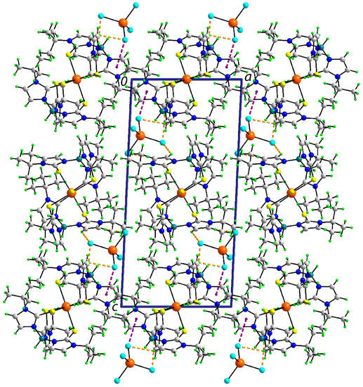 A view of the unit cell contents for [In(TmtBu)2](InCl4) is shown in Figure 6. Globally, when viewed down the b-axis, molecules of In1- and In2-containing cations and [InCl4]− anions stack in columns along this axis. The cations align in rows along the a-axis, and the rows alternate in an ···ABA··· fashion down the c-axis. Interspersed between rows are the [InCl4]− anions, and these are pivotal in providing links between the constituent cations. The primary mode of interaction is via C–H···Cl contacts of the type pyrazolyl-C–H···Cl and methyl-C–H···Cl; for geometric parameters characterizing these interactions, refer to Table 5. The anion also forms an In–Cl···π(pyrazolyl) interaction, which is discussed in more detail in Section 3.3.