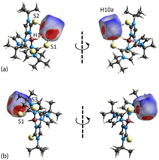 Hirshfeld surface analysis was also performed for the central thallium atom (Figure 8). The dnorm map displays several weak to intense red spots indicating additional intramolecular interactions between B1–H1···Tl (dnorm distance = 2.69 Å vs. ΣvdW = 3.05 Å) and C10–H10a···Tl (dnorm distance = 3.00 Å vs. ΣvdW = 3.05 Å) on top of S1···Tl, S2···Tl and S3···Tl contacts, as described above.