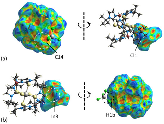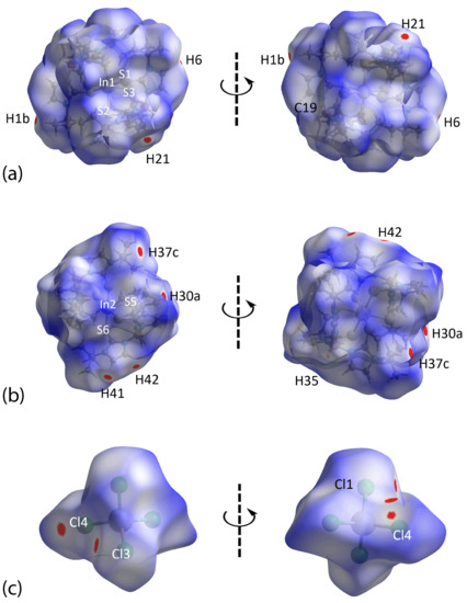 The dnorm analysis was also conducted for each of the In1- or In2-containing cations and In3-anion in [In(TmtBu)2](InCl4) (Figure 9). A number of red spots with moderate intensity are observed for close contacts comprising C41–H41···Cl3, C21–H21···Cl1, and C42–H42···Cl4, in accordance with those interactions identified through the geometric analysis conducted with PLATON [31]. However, additional contacts were noted through the dnorm map arising from H37c···H30a, with moderate intensity, as well as from C1–H1b···Cl4, C6–H6···Cl4, and C35–H35···C19 with weak intensity. Table 6 summarizes these contacts and compares the separation distances with the respective van der Waals radii.