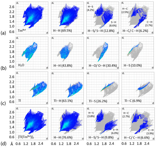 The overall two-dimensional fingerprint and decomposed plots delineated into the major contacts along with the percentage distributions for (a) TmtBu, (b) H2O molecule, (c) thallium center, and (d) [Tl(TmtBu)]2 dimer for [Tl(TmtBu)]2∙2H2O.
