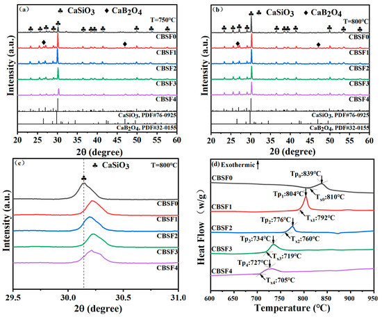 (a) XRD patterns of the CBSF glass-ceramics sintered at 750 °C; (b,c) XRD patterns of the CBSF glass-ceramics sintered at 800 °C; (d) DSC curves for the CBSF powder samples.
