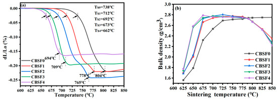 (a) The sintering shrinkage profile of CBSF glass-ceramics; (b) bulk densities of CBSF glass-ceramics sintered at different temperatures.