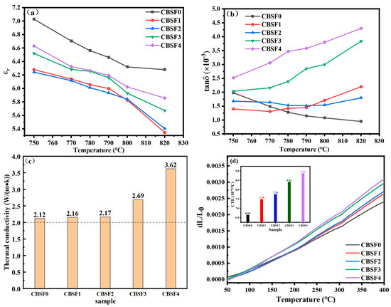 In Figure 5c, the λ of CBSF glass-ceramics doped with 0–16 wt% CaF2 sintered at 790 °C is presented. The findings demonstrate that the λ of the CBSF samples increases gradually with an increase in CaF2 content, with a maximum value of 3.62 W/(m·k) for CBSF4, which is mainly attributed to the partial destruction of the Si-O-Si structure by fluorine ions, decreasing the glass viscosity, leading to liquid phase formation at low temperatures and promoting the sintering compaction of the ceramic [29,30]. In Figure 5d, the CTE of CBSF glass-ceramics doped with 0–16 wt% CaF2 sintered at 790 °C is presented, which shows that the linear deformation of glass ceramics increases from room temperature to 400 °C. The CTE value is found to increase from 6.65 × 10−6/°C to 8.88 × 10−6/°C with an increase in CaF2 content, which is favorable for LTCC applications.