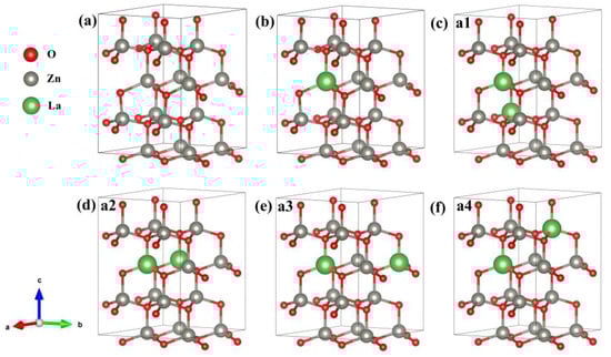 Calculation model. (a) Zn16O16, (b) Zn15La1O16, (c) Zn14La2O16a1, (d) Zn14La2O16a2, (e) Zn14La2O16a3, (f) Zn14La2O16a4. Annotation: a1–a4 represents four different configurations for Zn14La2O16.