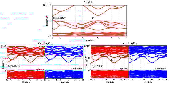 Figure 2b,c show the energy band structure of Zn15La1O16 and Zn14La2O16. Analysis shows that the band gap value of Zn15La1O16 is 3.16 eV, and the band gap value of Zn14La2O16 is 2.90 eV. With the increase in the La atom doping concentration, the band gap decreases; this is consistent with the results obtained by R. Bomila et al. [34] using UV-VIS spectral data to determine that the band gap energy decreases with the increase in the La doping concentration. The decrease in the band gap is beneficial to improve the optical and electron transport characteristics of the doping system, which is explained by the combined action of the Burstein–Moss effect and the renormalization effect. After the doping of La atoms, the energy band voltage decreases, indicating that the effective mass of electrons in the energy band increases, the degree of localization increases, the atomic orbital expansion weakens, and the number of the conduction band and valence band energy bands increases significantly. The energy band structure is more compact. The doping of La atoms enhances the interaction between different atoms, indicating that the existence of impurity atoms will strongly interfere with the electronic structure of the ZnO semiconductor, which can be further verified by analyzing the splitwave state density. Compared with the energy band structure diagram of Zn16O16, the conduction band and valence band of all doped systems move towards the low energy direction. As the valence band moves down more, the Fermi energy level enters the conduction band. The combined action of the Burstein–Moss effect and the band gap contraction effect explains this phenomenon [35,36]. The La atom introduces impurity energy levels at the bottom of the conduction band and the top of the valence band. In combination with the density of states in Figure 2b,c, the impurity energy levels are mainly contributed by the electrons of La-5d and -6s states, indicating that the doping of ZnO with the La atom is a donor-type doping. The introduction of extra carriers (electrons) by the La atom enhances the conductivity and metallicity of the system and these carriers degenerate. Therefore, the La-doped ZnO systems are n-type degenerate semiconductors. The difference between the Fermi level of Zn15La1O16 and the bottom of the conduction band is 1.48 eV, and the difference between the Fermi level of Zn14La2O16 and the bottom of the conduction band is 1.87 eV. Zn14La2O16 shows stronger metallicity and conductivity. The results show that the La-doped ZnO system has photoelectric transport characteristics, which can provide theoretical guidance for the experimental preparation of highly conductive ZnO thin films. In addition, the spin-up and spin-down band structures of the La-doped ZnO system are the same and no spin splitting occurs, indicating that La-doped ZnO materials do not exhibit magnetic characteristics.