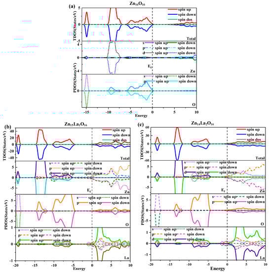 The density of the state is one of the important properties of semiconductor materials. It can scientifically explain the energy band structure, optical properties, and magnetic properties of semiconductors, and is a visual result of the energy band structure. Figure 3 shows the total density of states and partial density of states of intrinsic ZnO and La-doped ZnO systems under spin polarization conditions. Figure 3a shows the total density of states and the density of separated states of Zn16O16. Analysis shows that the GGA+U method can correct the interaction between electrons in the atomic orbits. The electronic density of the Zn-3d state and O-2p state in the valence band near the Fermi level are obviously separated, so the valence band becomes wider and the p-d hybridization becomes weaker. In the deep valence band −15.8 eV~−14.3 eV region, it is contributed by O-2s state electrons, and its locality is strong. In the −10.3 eV~−6.9 eV valence band region, it is contributed by Zn-3d state electrons and some O-2p state electrons. Therefore, there is a strong pd hybridization between Zn-3d state electrons and O-2p state electrons, forming a stronger Zn-O bond. In the upper valence band −6.3 eV~0 eV region, it is contributed by O-2p state electrons, and in the conduction band region, it is contributed by Zn-4s and 3p state electrons. The calculations are consistent with the theoretical calculations of Li. H [37]. In addition, it is found that the Zn-4s state electrons determine the bottom position of the intrinsic ZnO conduction band, and the O-2p state electrons determine the top position of the intrinsic ZnO valence band. Therefore, when the Zn atom and the O atom bond, the electrons in the above two states interact to form a chemical bond, of which the electron in the O-2p state contributes the most [38]. In addition, the total state densities of intrinsic ZnO are completely symmetrical in spin-up and spin-down conditions, and the net spin state density is a straight line, indicating that the intrinsic ZnO is nonmagnetic.