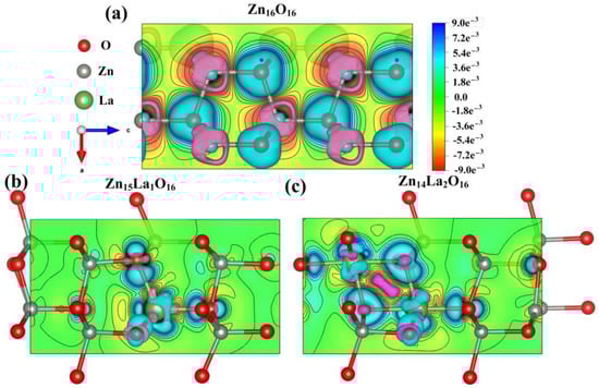 By analyzing the differential charge density diagram of ZnO before and after doping, the bonding between atoms in the La-doped ZnO system can be discussed in a more vivid and intuitive manner [43,44]. The differential charge density distributions of Zn16O16, Zn15La1O16, and Zn14La2O16 on the plane of the doped La atom under spin polarization conditions are calculated, and the calculation results are shown in Figure 4. In the figure, the green electron cloud represents electron aggregation, the pink electron cloud represents electron dissipation, the red color scale bar represents electron gain, and the blue color represents electron loss. The darker the color is, the more electrons are transferred. It can be seen from the analysis that, compared with the electron cloud between the Zn atom and O atom in the intrinsic ZnO system, the doped La atom has a greater impact on the electron cloud density of the surrounding O atom, the interaction is enhanced, and the directivity of the electron cloud is strong. Most of the electrons lost in La are transferred to the O atom. With the increase in the doping concentration of the La atoms, the electron transfer density in the La-O bond area increases, but the overlap of the electron cloud between the La atom and the surrounding O atom in the doped system is weakened. The covalent bond of the doped system is weakened, while the ionic bond of the doped system is strengthened. The calculated results are consistent with the population value, bond length, and stability analysis results of the doped system. These results also can be described by NBO methods, which will be used to further analyze the orbital charge in the future study.